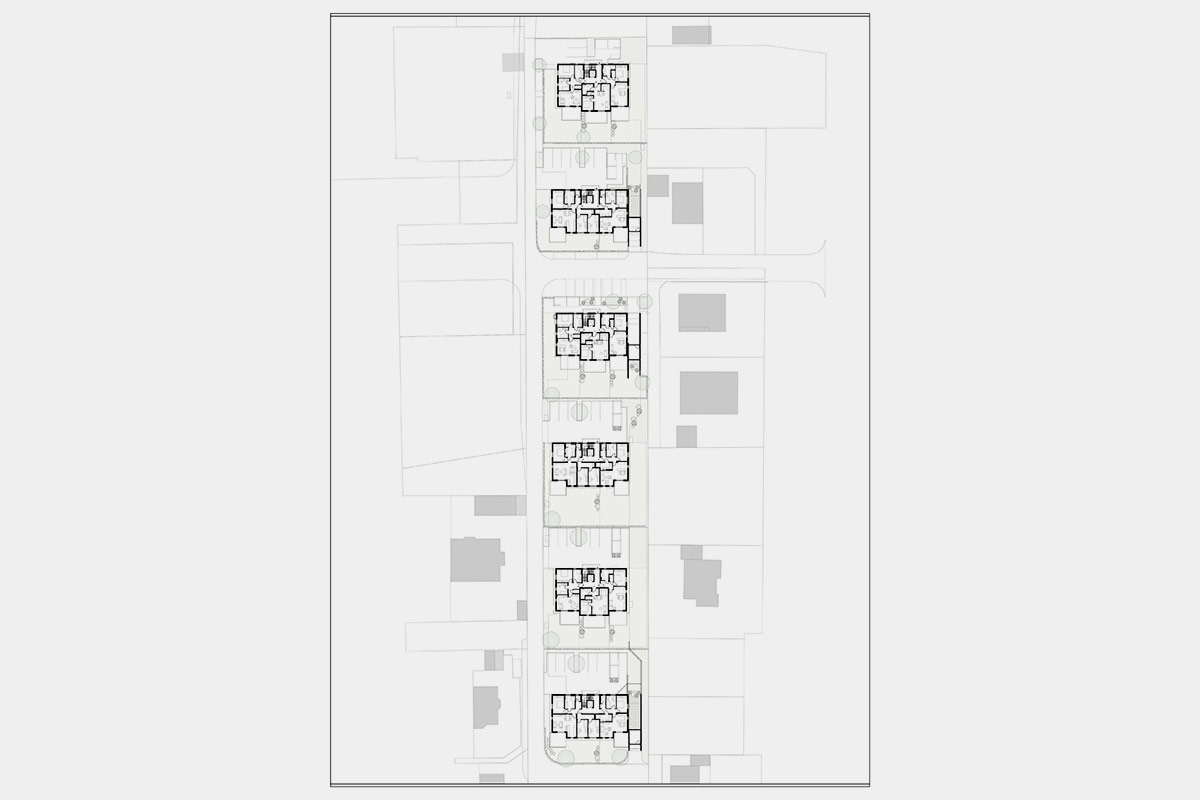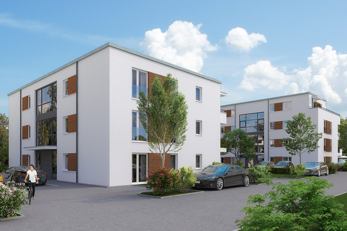 Sechs Mehrfamilienhäuser in drei Bauabschnitten mit insgesamt 50 Wohnungen und gemeinsamen Tiefgaragen