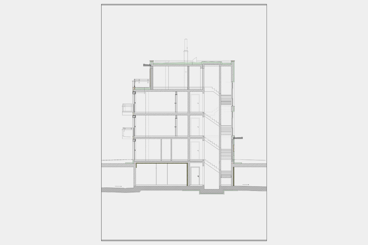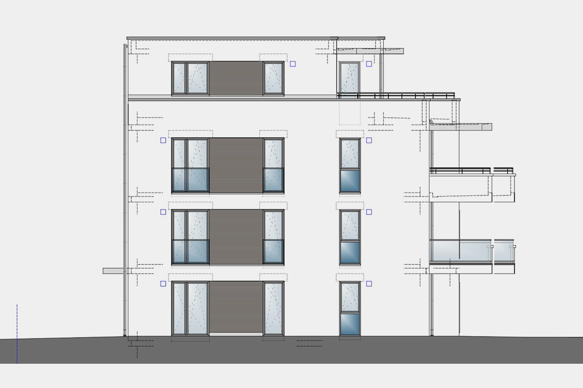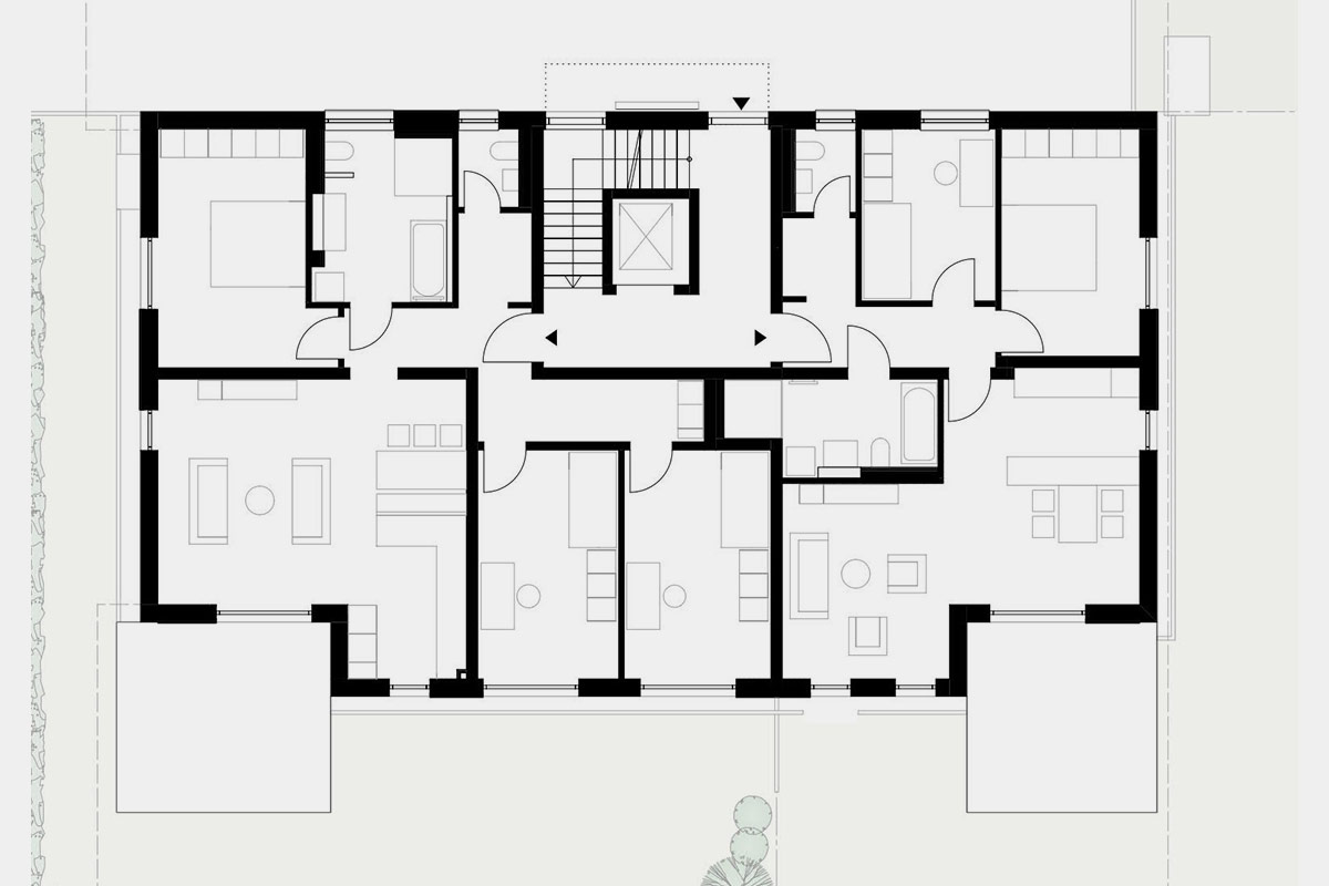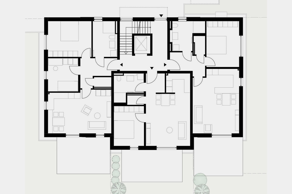 Beengte städtebauliche Verhältnisse im Herzen der der Gemeinde konsequent genutzt um großzügige und helle Wohnungen auf III+D Geschosse zu konzipieren.